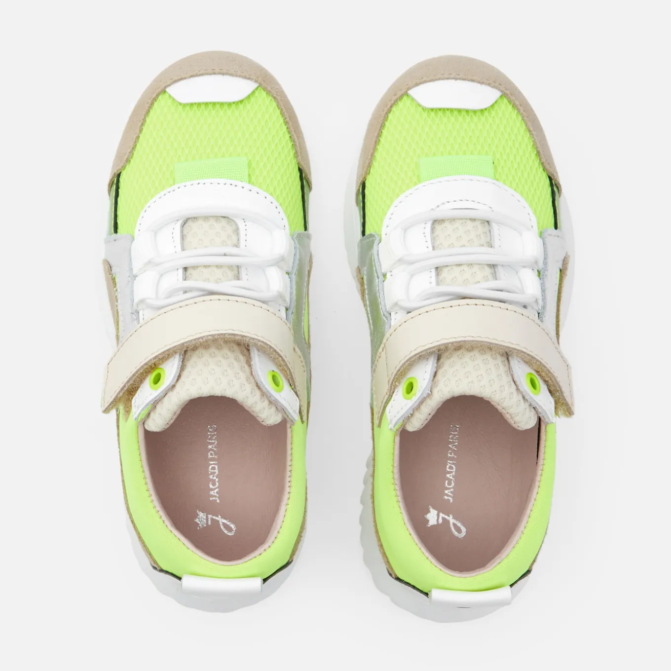 Contemporary and easy to slip on, these girl sneakers have a neon color block look for the start of the season. Made from leather and textile, with silver-colored inserts, a Velcro strap and round laces, these runners are ideal for wearing with shorts or wide-leg trousers from the start of the new school year for a city look.