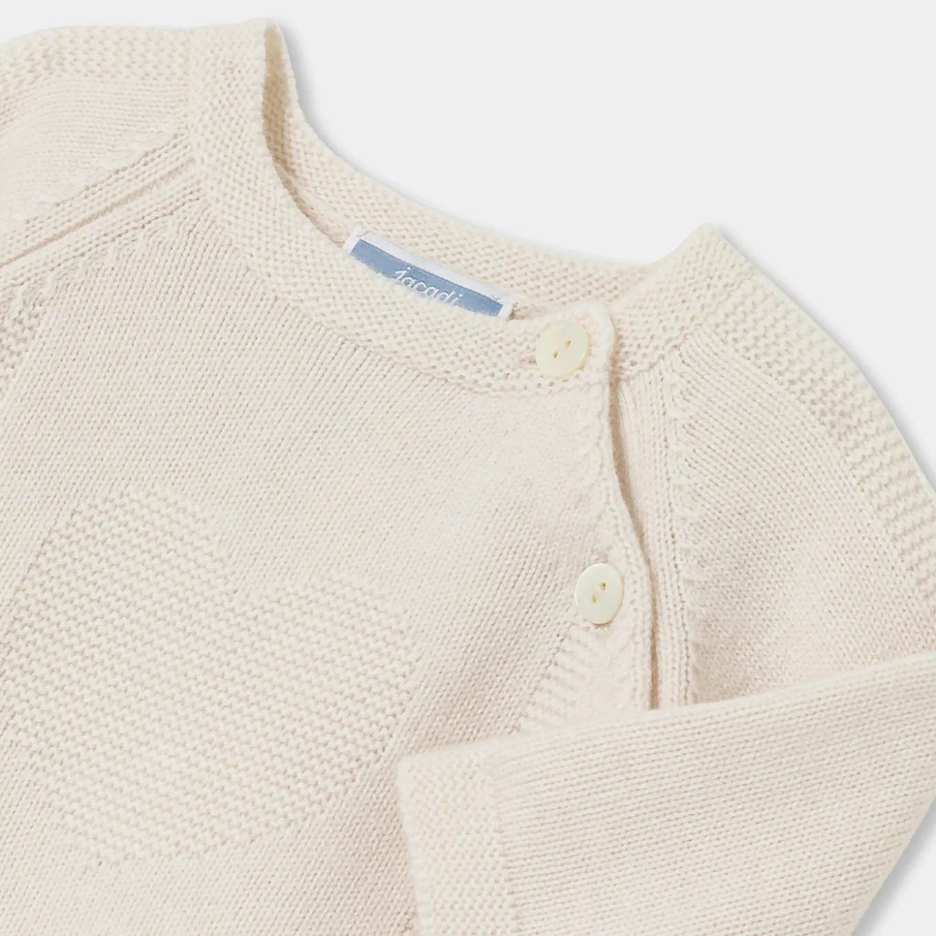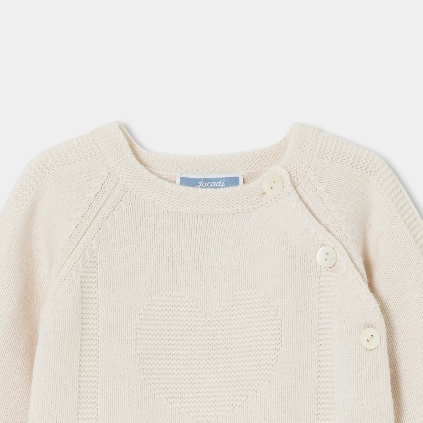 – Garter stitch details on sleeves and legs.