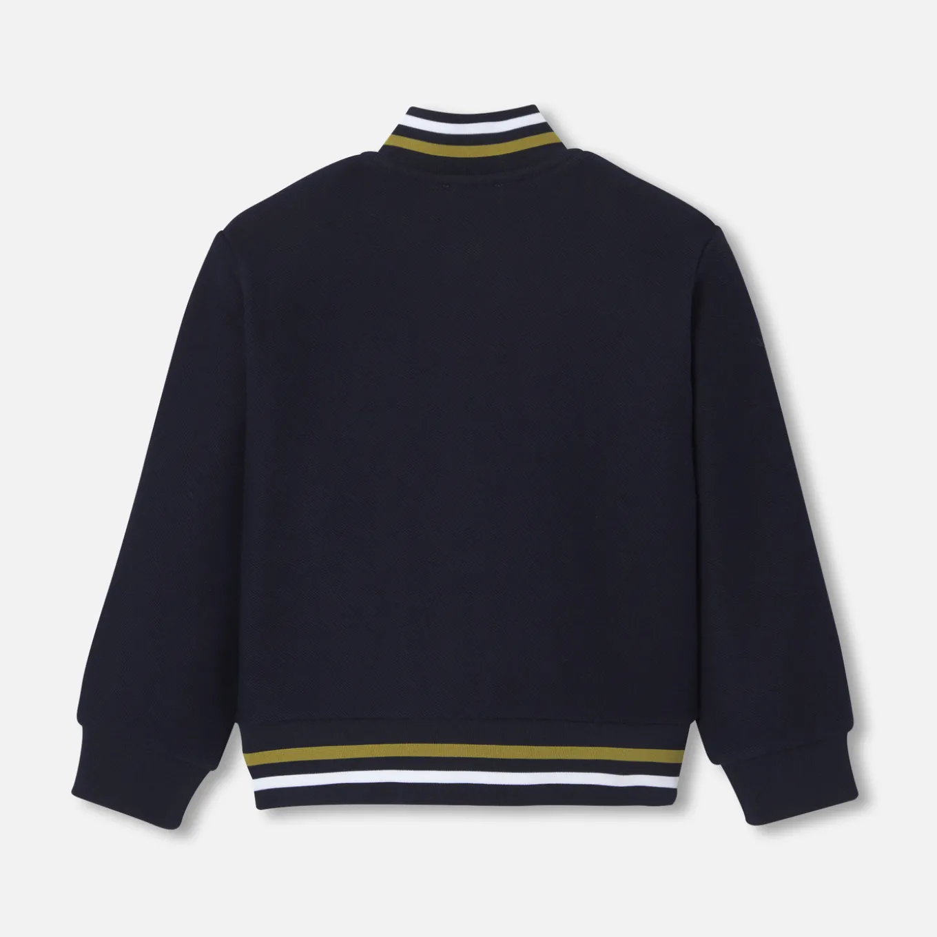 – Striped ribbed collar and hem